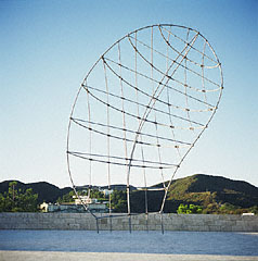 A marvel of artistry and engineering, Martin Puryear's sculpture rises on six slender legs to a height of forty-five feet above the broad expanse of travertine pavement on the plaza at the Getty Center. Stout strands of silver-patinated bronze bind the joints of the airy network of welded, sandblasted stainless steel tubes, two and three inches in diameter. Elegant in its apparent simplicity, the sculpture's complex structure reveals its true character only slowly. The sculpture's meaning likewise resists a fixed identity, suggesting both a delicate fishnet cast against the sky and a human head in profile. From some viewpoints, it appears to be fully round, but its south face is flat, while the north face curves gently through the air.
