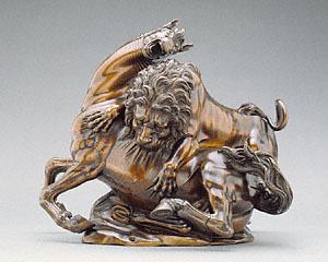 The tabletop bronze of a lion attacking a horse exhibits a dramatic life and death struggle typical of the intense emotionalism of early Baroque sculpture. Both the bronze and its pendant, Lion Attacking a Bull, feature a wild beast, the ferocious lion, attacking a domesticated animal and forcing it to collapse. The artist delighted in the power of the animals, whose muscular contortions express their physical struggle and psychological anguish. In Lion Attacking a Horse, the artist emphasized the brutality of the kill, using a circular composition to focus attention on the lion's claws tearing through the horse's hide. Animal subjects were extremely popular in the early 1600s and a genre for which the sculptor, Giambologna, was well known. Lion Attacking a Horse is based on a fragmentary antique statue now in the Palazzo dei Conservatori, Rome. Many casts of the Lion Attacking a Horse are extant; the Museum's bronze is among the highest in quality of those that survive.