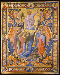 This elaborate initial, which originally began the chant for the feast of the Ascension, came from a large gradual made for the monastery of Santa Maria degli Angeli in Florence, of which Lorenzo Monaco, the designer of this image, was a member. Zanobi di Benedetto Strozzi and Battista di Biagio Sanguini probably painted this initial more than a decade later.