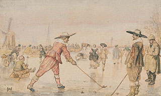 Under a pale grey winter sky, a variety of figures enjoy ice skating, sledging and conversing. In the foreground, two men play colf, a traditional Dutch sport that is a cross between golf and ice hockey. Hendrik Avercamp, was the first Dutch artist to elevate watercolor and gouache drawings to the status of paintings. His skill is visible here in details like the fine pen and ink lines describing the figures, or the delicate gouache coloring suggesting shadows on the ice. His typical monogram is visible in the lower left (the letter H enclosing the letter A ), indicating he saw this as a finished work, not a study. Avercamp was a prolific draftsman, and helped popularize such landscapes with seventeenth-century Dutch collectors. His contemporaries would have appreciated this winter scene on multiple levels. The skaters, some of whom have fallen on the ice, would have suggested the notion of de slibberachtigheyt van's menschen leven or "the slipperiness of human life," to remind viewers of life's brevity.