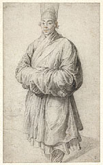 Peter Paul Rubens probably made this study of a man in Korean costume as an independent work of art. Since contact between Europe and Korea was almost non-existent in Rubens's time, how he came into contact with Korean silk robes and transparent headdress in Antwerp remains a mystery. In the background, Rubens sketched a small boat to emphasize a distant place, but he was clearly more interested in the costume than in providing a detailed setting. The drawing is one of Rubens's most meticulous depictions, enriched by touches of red chalk added to the man's face. Fascinated by the play of light on the silk, Rubens juxtaposed black chalk and white paper to create the man's shimmering costume. This drawing later inspired one of the central figures in Rubens's painting The Miracles of Saint Francis Xavier in the Kunsthistorisches Museum, Vienna.