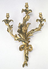 Modeled in the form of three laurel branches tied with a ribbon, these massive wall lights with their detailed chasing and burnishing reveal the extraordinary skill of their maker, a silversmith to Louis XV, king of France. Each wall light is slightly different from the others. These four wall lights are among eight made in 1756 for the newly redecorated interiors of the famous Parisian palace, the Palais-Royal, which was the residence of the king's cousin, Louis-Philippe, duc d'Orléans. Shortly after inheriting the building in 1752, he commissioned the architect Pierre Contant d'Ivry to renovate the main rooms. Engravings of these rooms, showing the wall lights in place, were reproduced in Diderot's Encyclopédie, one of the principal works of the Age of Enlightenment. An inscription on the Getty Museum's drawing for one of these wall lights explains that it should hang above the fireplace.
