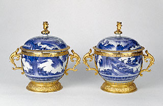 In the early 1700s, English author Daniel Defoe complained that "Queen Mary introduced the custom...of furnishing houses with Chinaware...piling the China upon the Tops of Cabinets, Scritoires, and every Chymney Piece." The greater availability of Chinese and Japanese porcelain from the mid-1600s onwards increased interest in this exotic material. Nobles throughout Europe collected porcelain and created "China Cabinets." In such rooms, walls were completely decorated with ceramics, displayed on brackets, mantelpieces, shelves, and sometimes even on the floor. Although some members of the British aristocracy collected mounted porcelain, they did not assemble the same quantities as the French did. In 1678 one English duchess took her collection of porcelain to France, where it fetched much higher prices at a sale. This pair of lidded bowls was assembled in London, perhaps for a sophisticated member of the court of Charles II. Recently returned from France, he had developed a taste for these luxurious objects there.