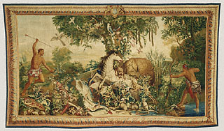 Studies made by two Dutch artists during an exploratory expedition to Brazil from 1637 to 1644 were the inspiration for this tapestry. The newly appointed Dutch governor, Prince Johan Maurits of Nassau, led a group of scientists and artists, including Albert Eckhout and Frans Post, to Brazil, where they studied and painted the unusual plant and animal life of this country. Many of the plants, fish, birds, and other animals woven in this hanging can be traced to life studies made by Eckhout and Post in South America. French artists at the Gobelins manufactory, who designed the cartoon to heighten the tapestry's impression of drama and exoticism, probably introduced other animals, such as the Indian rhinoceros and "striped horse" or zebra.