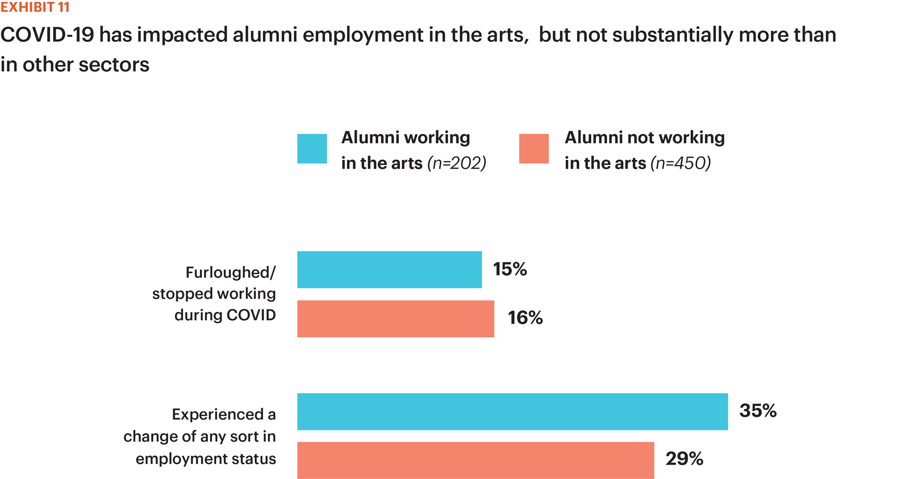 This quick study revealed that Getty Marrow alumni who were working in the field have experienced changes in their work status—including layoffs, furloughs, reductions in pay or hours, and foregoing promotions/pay increases—but not substantially more so than former interns working in other sectors (see Exhibit 11). Among survey respondents, 15% of those working in the arts have been furloughed or lost their jobs due to COVID-19 compared to 16% of alumni who have experienced job losses/furloughs and were not working in the arts.