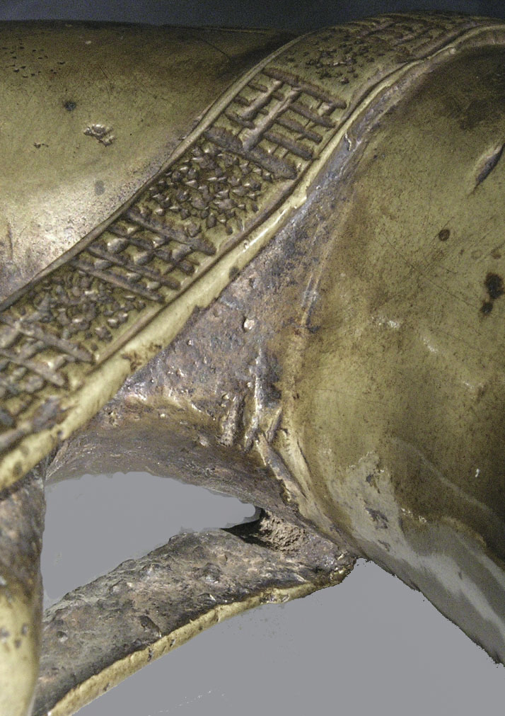 Once the metal had cooled in the mold, the investment was broken away to reveal the casting. FettlingDefinition: fettling: Steps carried out directly after casting to remove unwanted features, including oxidized metal, sprues, core pins, flashing, etc. Fettling may entail the use of power tools and/or hand tools such as saws, chisels, hammers, coarse files, …More was the initial step in finishing the raw casting with the retained sprueing system (runners and risers) and core pins cut back with chiselsDefinition: chiseling: Act of using a chisel and hammer to remove metal. With each strike of the hammer the tool jumps, often leaving a visible “step.” Chiseling may be part of either fettling or chasing.More and files. Once these features were removed, the artist had greater access to the as-cast surfaceDefinition: as-cast surface: Refers to the surface immediately after removal from the mold, before fettling and chasing.More, which in medieval western Europe was generally coarse and required significant finishing. One can get a better sense of this in areas inaccessible to tooling, like the undersides of handles, or animals’ indented paws or hooves.