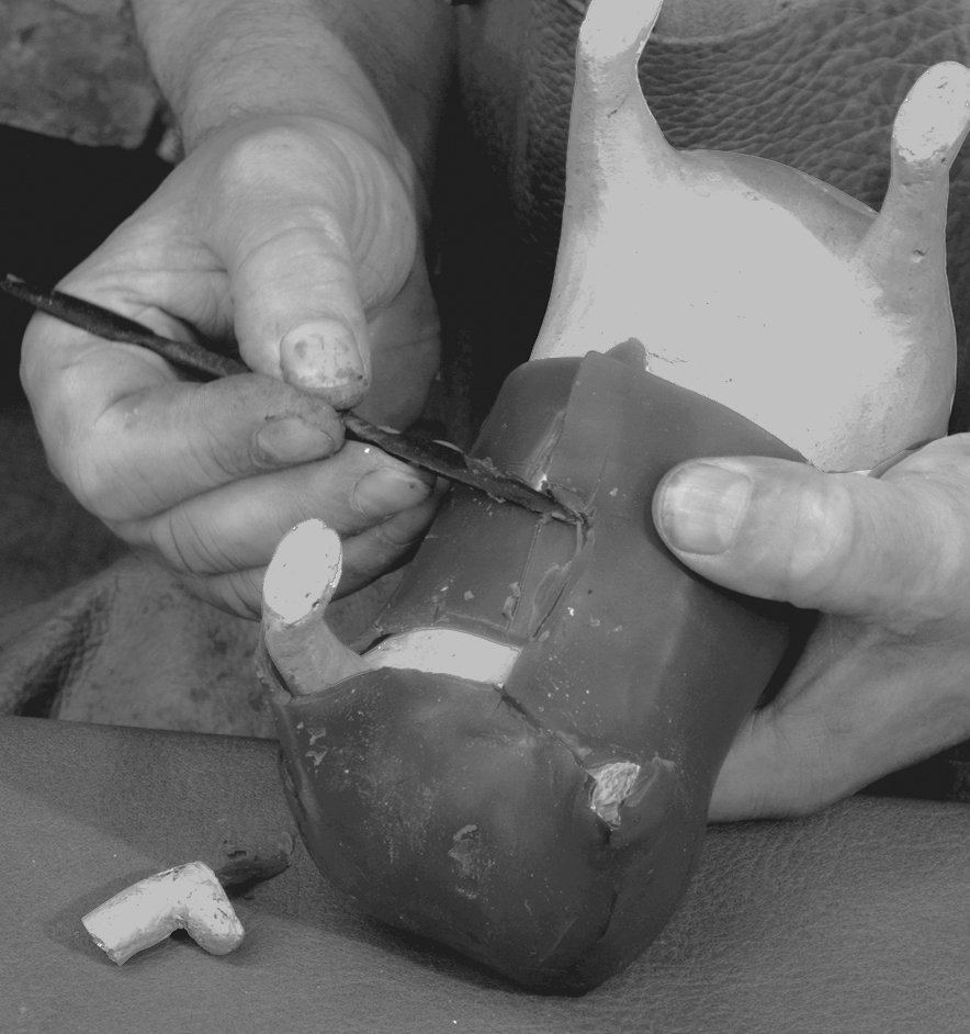 The model for the censer Theophilus describes was created by first overlaying the cured core with pieces of sheet wax rolled out to a specific depth, cut into “small pieces according to the spaces which you have cut in the clay of the censer.” These were warmed and applied with the aid of a hot iron, then trimmed and smoothed out, taking care that the thickness of the wax layer was “not thicker or thinner in one place than another.” Such evenness helps to ensure that the metal cools and shrinks at an even rate, avoiding distortions. The fine modeling of details can then begin. This same process was applied to the replication of the Lion aquamanile.