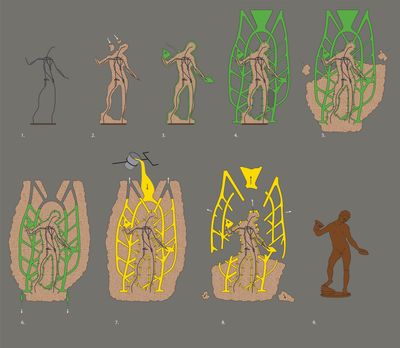 Radiography of the statues showed the relatively thick metal walls and the shape of the preserved vestiges of the original armatures. Few wax-to-wax joints are visible, and the internal surfaces do not conform to external contours. The latter features further support the hypothesis that the sculptures were directly cast.