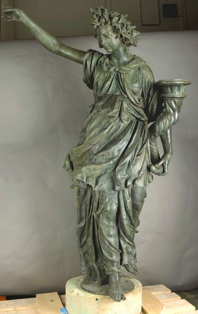 Clear traces of lost-wax castingDefinition: lost-wax casting: A technique in which a model made of wax is embedded in a refractory mold that is heated, thereby melting out the wax and creating a void to be filled with molten metal. Two primary variations of the technique are referred to as “direct” …More can be found in the modeling of details such as the vine leaf and cornucopia held by Abundance. They reproduce the malleable quality of the original model’s material.