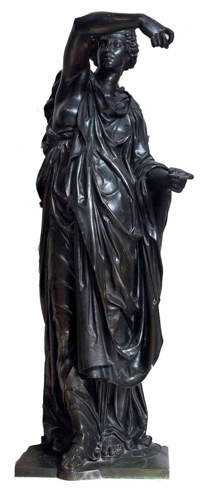 In 1571, Madeleine of Savoy, Anne de Montmorency’s wife, commissioned the architect Jean Bullant (French, 1515–1578) to produce a funerary monument for the heart of her husband. The monument, now in the Louvre, is composed of a sculpted stone column that would originally have been topped by an urn containing the heart. Bronze allegorical personifications of Abundance, Peace, and Justice were situated around the base of the column as witnesses to the character of the deceased. Bullant charged two sculptors to produce the statues. Prieur was responsible for Abundance and Peace, and Lefort made Justice. Péron was commissioned to cast the statues by Prieur. There is no record of who cast Lefort’s.