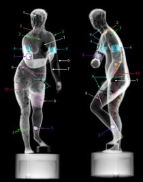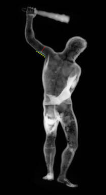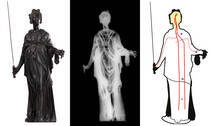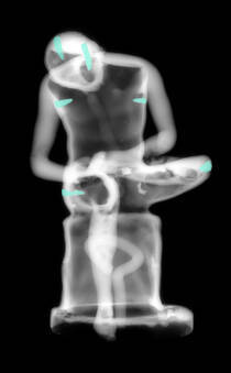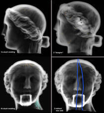 Radiography may be the only way of detecting the aforementioned features if the internal walls of the bronze are not visible. This is particularly the case for the small spherical globules testifying to the use of a plaster core or ceramic shell. And because of their location on the interior, wax-to-wax joints are generally hard to see and often detectable only by these means. They usually generate a thickening and/or thinning of the metal around the circumference of a body part that has been attached, for example below the shoulders, at the top of the thighs, or at the neck. They may appear on the radiograph as: