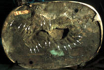 However, many of the features that relate to the construction and structure of hollow bronzes, such as diagnostic variations in the thickness of the bronze, or evidence of the various metal inserts such as and , are only discoverable through radiography. In many cases, access to the inside of a bronze may be impeded either by the shape and nature of the or by the remains of material. The description of each process will, therefore, fall into three sections: evidence on the outer surface, evidence on the inner surface, and radiographic evidence. A synthesis of all physical evidence related to the different processes is presented in table 4 Open viewer.