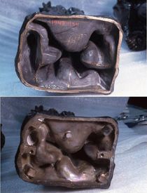 A smooth internal surface often occurs with lost-wax casting and particularly slush molding (fig. 53, I.1§1.2, I.1§1.3, and I.1§1.4). Some sand-cast animalier sculptures have been confused with wax (see I.1.n.21).