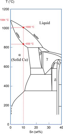 The melting temperature of copper alloys varies from 1084°C (pure copper) to approximately 1000°C for a copper bearing 10wt% tin (fig. 132) or 20wt% zinc, and down to 955°C for a highly leaded copper (36% lead). Melting temperatures as low as 900°C can be reached, for example, with 20wt% tin or 40wt% zinc. These temperatures hold for “normal” pressure conditions, namely 1 bar. Low melting temperatures are a distinct advantage for casting, as long as the other desired properties are not compromised.