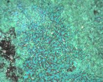The atoms that make up a metal or an alloy align themselves in geometric patterns, as opposed to most glass types, whose atoms are distributed randomly. These patterns are cubes for copper and copper alloys (fig. 139), with various displays of the atoms depending on the composition of the alloy: these are the phases. These patterns in turn form specific structures called microstructures. Once in a while, one might encounter a fine textile- or branch-like pattern (fig. 140) or a geometrical one (fig. 141) within the surface of a bronze. This is the microstructure of the metal, and is not to be confused with the mineralized remains of organic materials (pseudomorphs) that may form upon contact with a bronze surface during prolonged burial.
