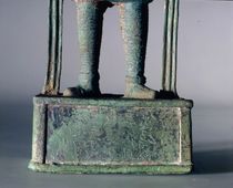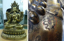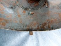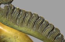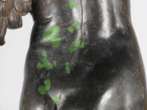 Taking a mold from an existing bronze to produce an may result in scratches in the patina or coating, or even into the metal of the bronze model along the of that new mold (fig. 128). Such damage can occur in the process of finessing the walls needed to define the boundaries of the mold pieces. Other traces of the after-casting process such as sketched outlines (fig. 129) or the remains of molding materials may also provide evidence that such an operation occurred. This may either confirm the relationship between a group of objects or lead to a search for one or more matching after-casts.
