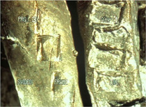 Usually, the tool marks made on the model prior to casting have a more fluid feel than those made in the metal due to the relative ease with which the materials can be worked (especially on a clay or wax model), with the edges being softened during casting as the more or less viscous liquid metal flows and solidifies (figs. 51, 52, 271, 272, Case Study 4). Under the microscope, it may be possible to observe that the mark retains its as-cast surface (fig. 273).