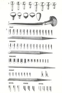 The cross section of a tool’s working face can help characterize the kind of mark it might leave (figs. 243, 245). Gravers, chisels, and scrapers have sharp cutting edges (figs. 276, 279). Other tools used in chasing have rounded faces or blunt edges.