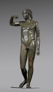 For the introduction of artificial patinas in the Hellenistic period see Eggert, Gerhard. 1994. “Schwarzfärbung oder Korrosion. Das Rätsel der schwarzen Bronzen aus chemischer Sicht.” In Das Wrack. Der antike Schiffsfund von Mahdia, edited by Gisela Hellenkemper Salies with Hans-Hoyer von Prittwitz und Gaffron and Gerhard Bauchhenß, 2:1033–40. Kataloge des Rheinischen Landesmuseums Bonn. Cologne: Rheinland Verlag.; Heilmeyer, W. D. 1994. “Zur Oberfläche antiker Großbronzen.” In Das Wrack. Der antike Schiffsfund von Mahdia, edited by Gisela Hellenkemper Salies with Hans-Hoyer von Prittwitz und Gaffron and Gerhard Bauchhenß, 2:801–7. Kataloge des Rheinischen Landesmuseums Bonn. Cologne: Rheinland Verlag.; Descamps-Lequime, Sophie. 2015. “The Color of Bronze: Polychromy and the Aesthetics of Bronze Surfaces.” In Power and Pathos: Bronze Sculpture of the Hellenistic World, edited by Jens M. Daehner and Kenneth Lapatin, 150–66. Los Angeles: J. Paul Getty Museum., 151–65. ↩︎