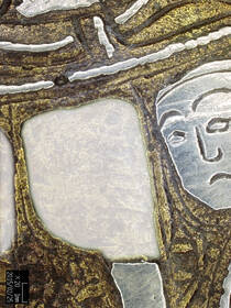 The applied materials may be clearly visible or presented more subtly, especially if small in scale or hidden by patina or . Overlays and inlays are also by their nature surface effects and susceptible to loss. Overlays are easily abraded, and mechanically attached inlays can be completely lost, leaving empty cavities.