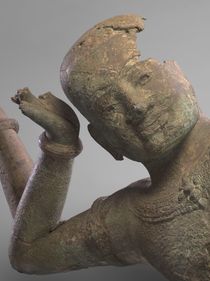 Metals for inlay are generally selected based on color, ductility, and melting point. They include gold (fig. 343), silver (figs. 293, 343, 344), copper (figs. 344, 345, 346),2 and iron, as well as alloyed (figs. 346, 347)3 and patinated metals.4 A copper-alloy inlay with a composition similar to the surface metal and with no color difference may suggest that it was originally patinated. Gray-colored inlays also occur, for instance in Buddhist statuary from Kashmir (eighth century CE).5 Lead-based compounds have been observed on Khmer bronzes (fig. 348). On ancient bronzes and Renaissance emulators, including Antico (Italian, ca. 1455–1528), tin may be confused with silver.6 Greater polychromy can be achieved by using multiple metals as inlays and overlays (figs. 349, 350),7 but also with gilding and silvering (see I.7).