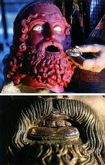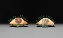 Many Egyptian, Greek, and Roman bronzes were produced with empty eye sockets for later insertion of naturalistic eye inlays (figs. 309, 311). Roman eye production was a specialized fabrication process and occupation (ocularis). Each eye includes multiple parts, such as copper supports and eyelashes, white stone or ivory sclera, and stone or enamel irises and pupils (fig. 351). During the Italian Renaissance these inlays were imitated (fig. 293).9 These apertures have no rear wall, as the inlays are held in place within folded copper sheets, often with eyelashes (fig. 340 I, fig. 351). The entire assembly may be lost during burial, revealing the empty eye socket.
