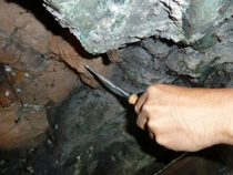 The sampling strategy depends on the degree and locations of access to the core. If there is easy access through an open underside or through casting flaws, for example, burins or chisels may be used to remove core material, which may be hard and compacted (fig. 432). If there is no obvious core material within easy view, exploration with a borescope may reveal pockets of hidden core. If access is difficult, a steel rod may be bent and sharpened into a customized sampling tool specifically shaped to reach the core location. Sampling may be monitored using the borescope, and dislodged blocks may be retrieved with a flexible claw pickup tool. Images collected during the process will ensure that the orientation of the block is documented.