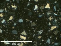 Basic petrographic analysis involves performing optical microscopy (OM) observations on transparent thin sections, usually about 30 µm thick, and preferably at least 1 × 1 cm. Commercial petrographic services will prepare appropriate thin sections from bulk samples for between US $30 and $75. Samples are observed primarily in transmitted light—either plane (linearly) polarized light (fig. 425) or crossed polarized light (figs. 426, 427, 428, see also Case Study 5), with magnifications generally in the 40–400X range, depending on the size of the mineral grains present. Sample material is always placed on a rotating microscope stage so that it can be observed at different angles with respect to the polarization angle of the transmitted light. An experienced petrographer can identify many specific minerals and other inclusions based on observation alone. To identify metallic minerals (which are not transparent), reflected light is also often added.