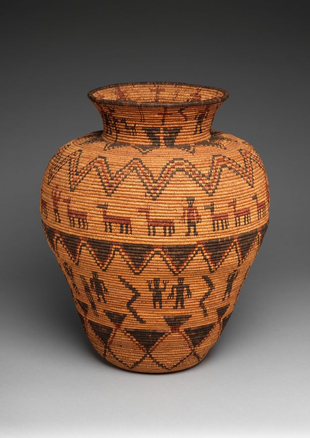 Text: This Western Apache storage basket was woven from natural materials including willow shoots, devil’s claw, and yucca root. While its design reflects the large storage baskets and/or shallow basket bowls traditionally produced by Apache women for domestic use, this basket was produced after railroad construction increased tourism in the Southwest and, therefore, was likely intended to be sold in the tourist market. Satisfying tourist interest in representational imagery, the basket is adorned with horizontal bands of geometric motifs flanked by asymmetrically organized animal and human figures. (value type: free text)