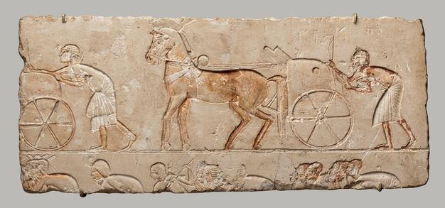 Text: Discovered within the sanctuary of the Great Temple of the Aten, this relief portrays scenes of a worshipping royal family surrounded by their awaiting horse-drawn chariots and attendant groups. (value type: free text)