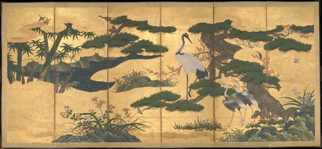 Text: With its depiction of a crane motif flanked by seasonal flowers, exaggerated trees, and brushwood in high releif, this work exemplifies the techniques espoused by Kano Motonobu’s (1476-1559) Kano School painting. Additional design elements likewise reflect the bold stylistic tendencies of prolific Japanese painter Kano Eitoku (1543-1590). The crane and natural elements, evidencing the transition from winter to spring, symbolize longevity and the progression of time.(value type: free text)