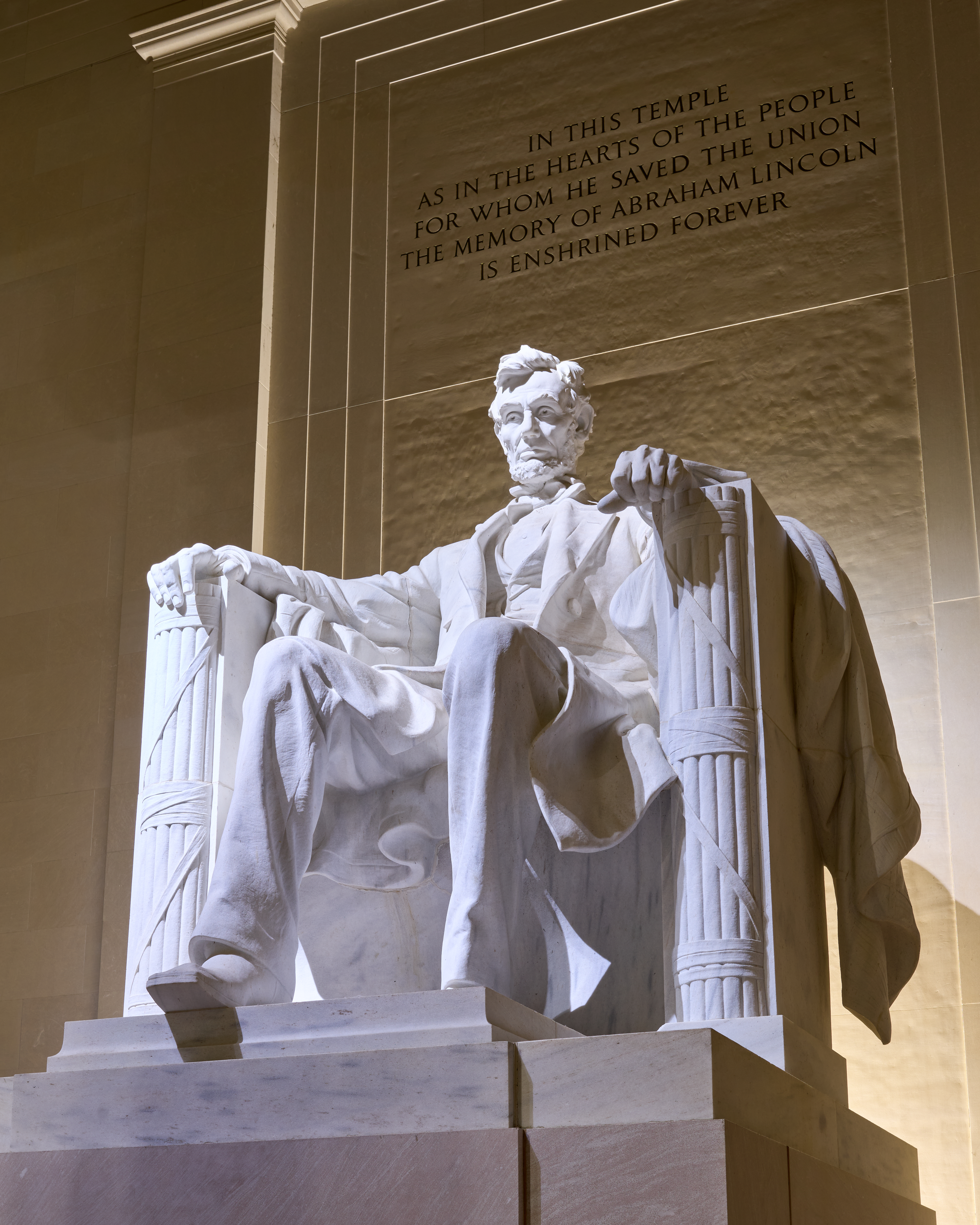 Transcription or Description: inscribed above the statue: IN THIS TEMPLE / AS IN THE HEARTS OF THE PEOPLE / FOR WHOM HE SAVED THE UNION / THE MEMORY OF ABRAHAM LINCOLN / IS ENSHRINED FOREVER; [the northern wall contains an inscription of Lincoln’s second inaugural speech, the southern wall contains an inscription of the Gettysburg address] (value type: free text)