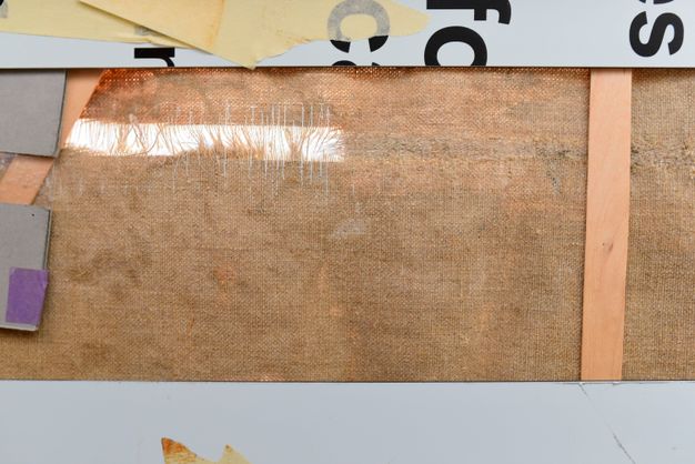 The third example was painted in the mid-1980s by a well-established contemporary European artist who works across mediums and uses an array of materials. The large-scale painting, measuring 84 × 150 inches (216 × 381 cm), was executed on a heavy-duty, coarse, densely woven linen. The auxiliary support was an underbuilt, seven-member wooden strainer with one horizontal and two vertical crossbars. The paint and ground layers consisted of textured multimedia layers ranging between 1/2 to 1 inch thick (1.3–2.5 cm); consequently, the painting is incredibly heavy. The ground was initially applied in a heavy impasto layer, followed by subsequent thinner layers of paint added in various manners, including drips, splashes, and by brush. The ground and paint layers had a characteristic drying-crack pattern that developed due to the artist’s process.