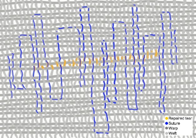 The sutures were introduced every third, fourth, and fifth weft thread, and all were staggered in length. It was determined that the sutures would be threaded under every warp thread. First, this was because the canvas weave was so large the sutures could easily pass through without disrupting the bond between the ground layer and the canvas. Second, the closer and more aligned to the weft thread the sutures were, the more sympathetic the support from the reinforcements would be to the canvas weave structure, ultimately creating a stronger and more stable bridge.
