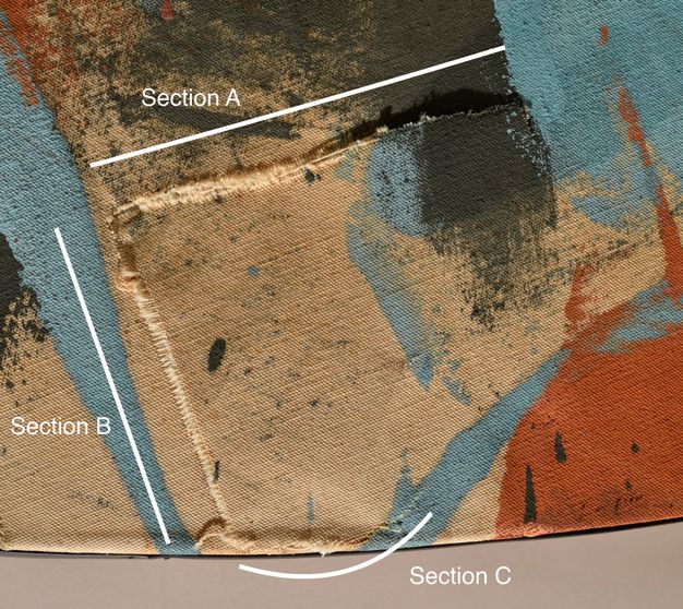 This last case study presented another unique challenge in that each of the three sections of the C-shaped tear had different properties that needed to be considered when determining the suitability for verso reinforcements. Each direction of the tear was evaluated individually to assess the impact of the direction on the tear and the painting as a whole. This resulted in a variety of reinforcements that were unique to each problem. For clarity, I will discuss each section of the tear separately: section A represents the top, horizontal tear; section B, the vertical section; and section C, the lower horizontal section along the turning edge of the painting (see fig. 31.6).