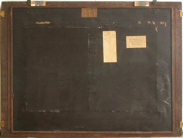 The painted canvas backing has the appearance of imitation leather; it was stretched over the reverse of the painting and tacked to the back of the frame. Narrow wooden fillets were pinned along the edges to improve the seal. An example of this method can be seen on a painting by Johann Gottfried Steffan (1815–1905), The Torrent, 1844/1848 (1545–1869), and probably dates from 1869, the year it was acquired (fig. 33.2).