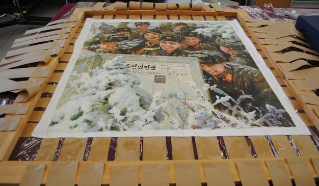 Three Korean paintings on cotton were acquired recently, which date from the early 2000s.12 They arrived rolled and had many distortions. They were returned to plane through moisture treatments while on a loom. Strips of kraft paper were attached to the canvas edges and then wetted and attached to the loom (fig. 33.6). Humidity was introduced to the reverse of the canvas with damp blotting paper through Gore-Tex. The paper shrinkage exerted tension as the whole structure slowly dried. Fiona Rutka, a student intern, did most of the work on these paintings. They were put onto new stretchers over loose-linings of polyester sailcloth.