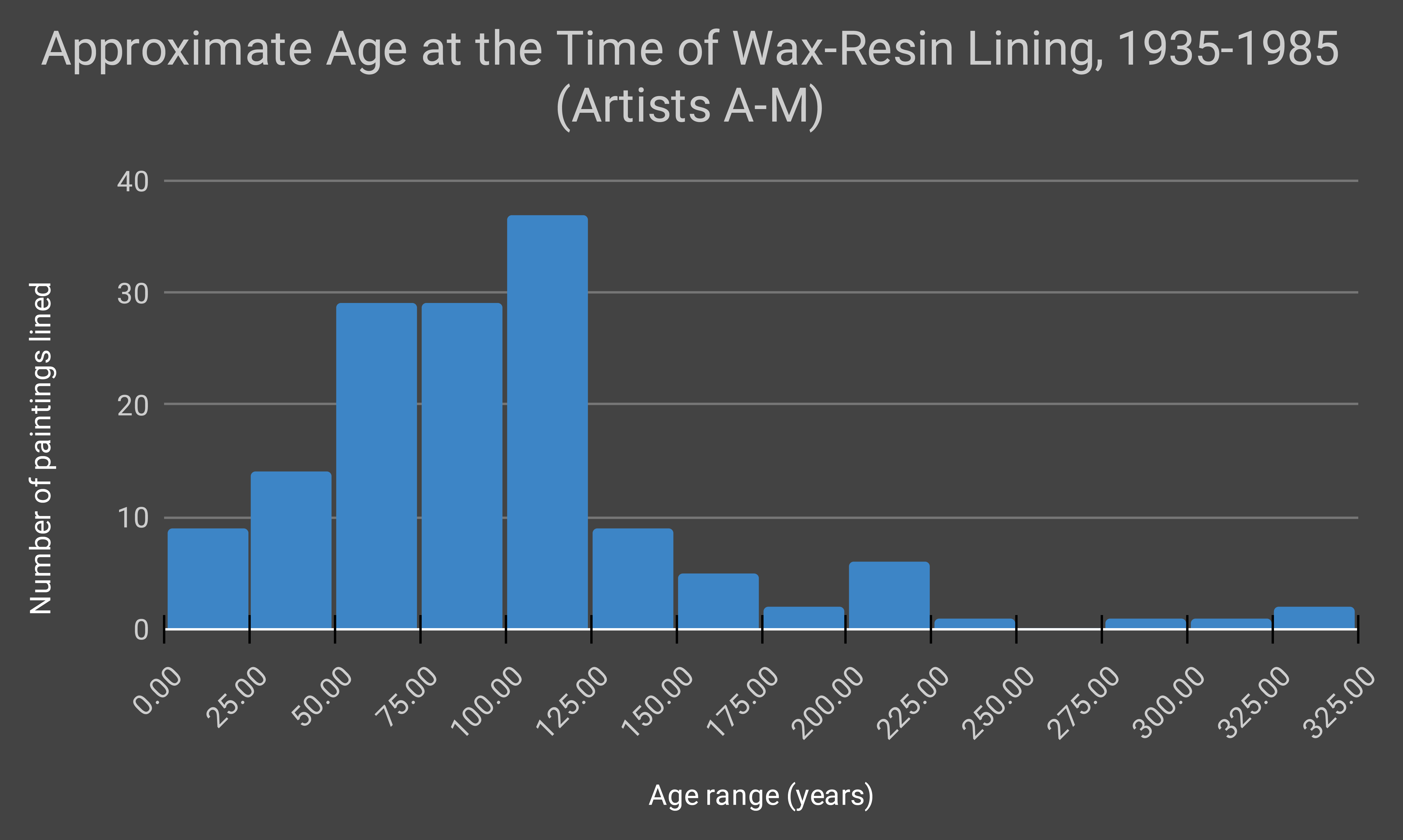 Most of the paintings wax-resin lined at BkM were between 50 and 125 years old at the time of lining (fig. 41.3), including paintings from the early nineteenth century through the 1930s. Few paintings predating the nineteenth century were lined at BkM, which likely reflects the strength of BkM collection holdings in certain areas.
