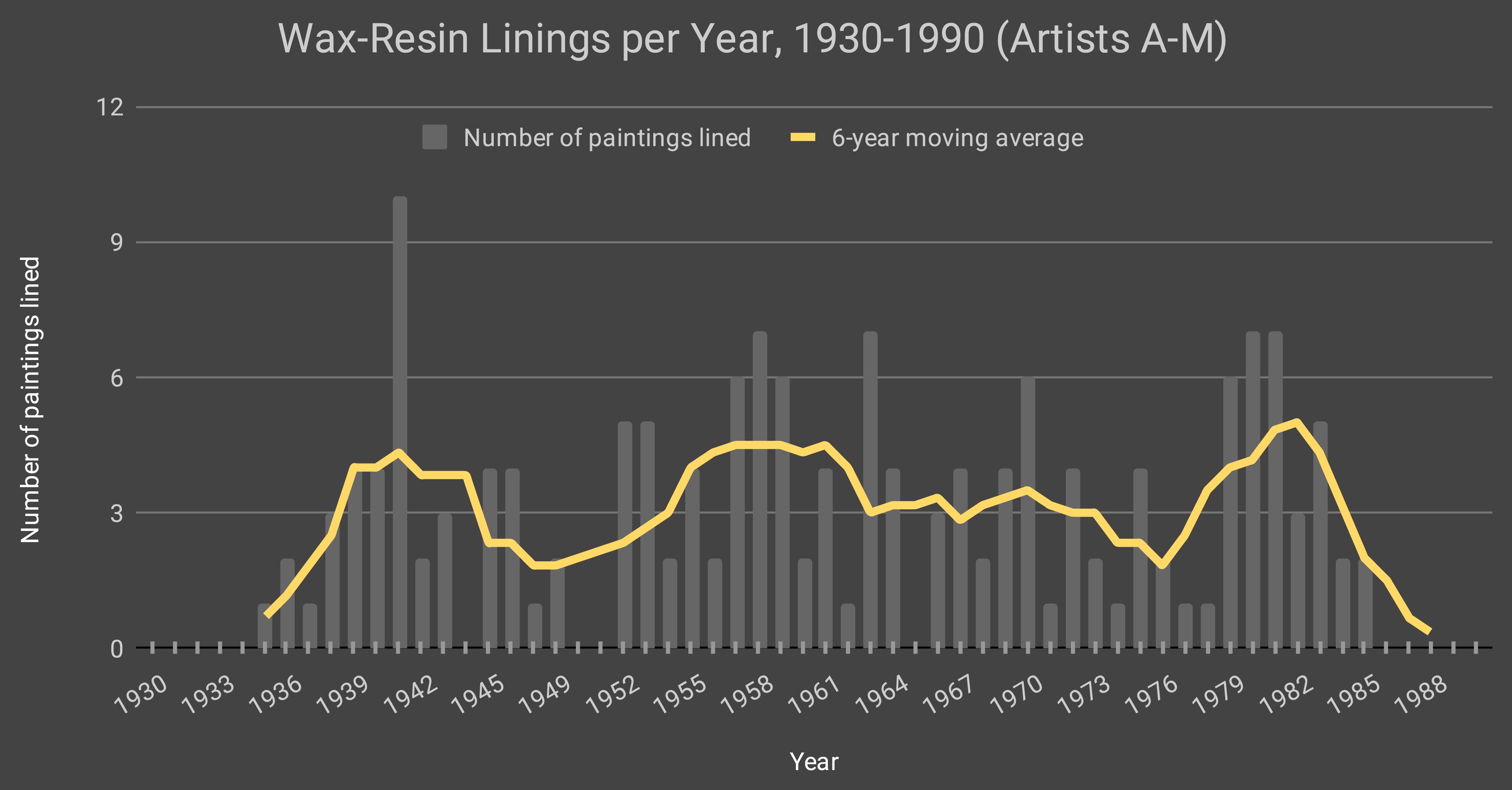 Some variations in lining frequency may be linked to new technology, such as the vacuum hot table acquired in 1961, and/or staffing changes that occurred in the department over the decades. The apparent increase in numbers observed in the late 1970s and early 1980s warrants further investigation, considering the critical attitudes against lining that developed in the field of conservation at this time.