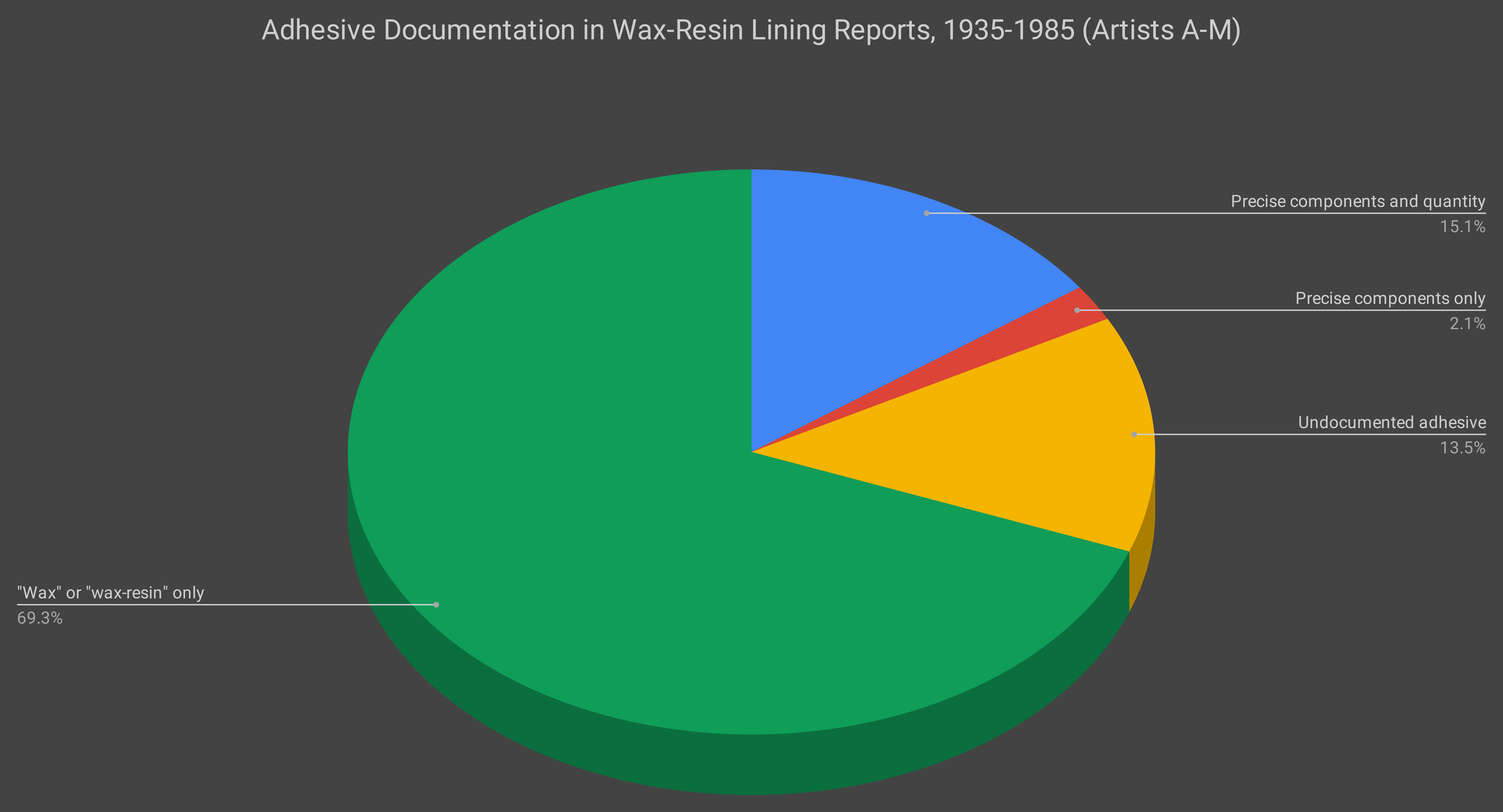 There were significant periods when adhesive components were not listed each time a lining was performed (fig. 41.5). The earliest reports, dated 1936–40, reliably include the same formula of 60 parts beeswax, 35 parts dammar resin, and 5 parts Canada balsam. In 1941, the terms wax resin and wax were used alone, without specifying components. Reports from 1942–44 contain a similar recipe to the earlier one, with slightly different proportions: 65 parts beeswax, 30 parts dammar resin, and 5 parts Canada balsam. The term wax resin predominates again from 1945 to 1946, and from 1961 onward. These trends indicate that generic language was common once the same formula had been used for a while, with little variation.