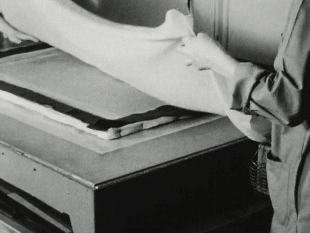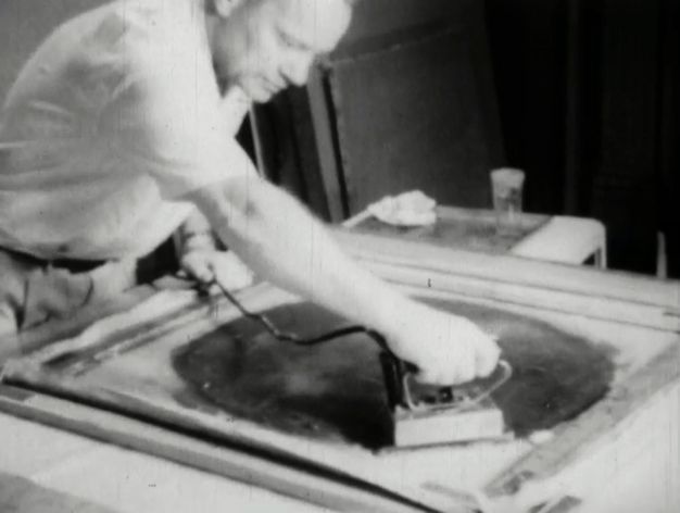Archival research has provided valuable insights into BkM treatment methods absent in the documentation. In 1954 and 1962, Sheldon and Caroline produced two films for a general audience, both of which illustrate the complex operation of performing a wax-resin lining. The earlier film features a lining executed with a hand iron (fig. 41.1) (Keck, Caroline, and Sheldon Keck, dir. 1954. A Future for the Past. Audiovisual collection, Brooklyn Museum Archives, Brooklyn, NY. Digitized from 16 mm film.), and in the later one, conservators demonstrate the use of a vacuum hot table (fig. 41.2) (Keck, Caroline, and Sheldon Keck, dir. 1962. Hidden Life of a Painting. Audiovisual collection, Brooklyn Museum Archives, Brooklyn, NY. Digitized from 16 mm film.). In both films, the narration illuminates the reasoning behind each action and material selected. The filmed processes are remarkably consistent with physical evidence of lining observed on many paintings in the collection, such as paper residues on the tacking margins or brush marks and fingerprints on the versos of paintings lined by hand.