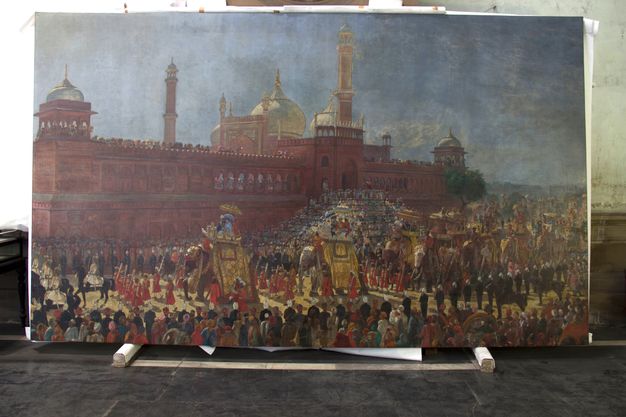 The foremost priority of attending to the structural repair of the painting Delhi Durbar (1903) was to make it stable. We have successfully resolved that issue. The assignment was very special to us, as the infrastructure actually required for handling such a magnificent painting was not available, but we successfully overcame those issues with our limited resources and practical experience. In the meantime, the Royal Gallery of Victoria Memorial Hall has been renovated and reopened to the public after two decades. We are happy to see Delhi Durbar (1903) on display again at the Royal Gallery.