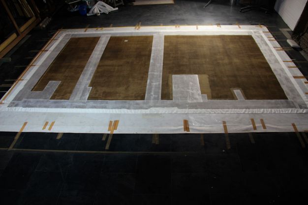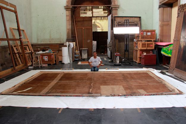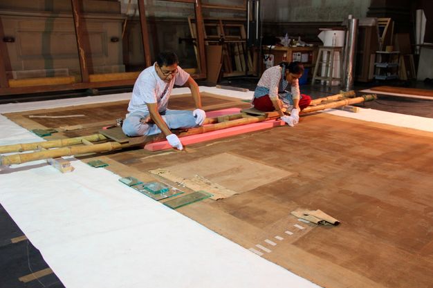 Manual cleaning with scalpels was also done to remove the old patches and their residual dry adhesive (fig. 61.4). It was decided not to remove the vertical patches in one go, as it was observed that they held the original canvas together. The termite damage had eaten away at the original support, effectively splitting the canvas into two almost independent sections. Had the vertical patches been removed all at once, it could have made it difficult or impossible to exactly align the two halves of the painting. Therefore, the patches around the perimeter of the support were removed first, leaving the central ones intact. The strip-lining of Beva 371 and sailcloth was then applied to the perimeter.