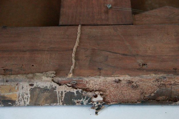 Numerous patches (also undocumented) had been applied to the reverse of the canvas to provide support for tears and holes. These were attached using an animal glue as a binder, and the glue had degraded, resulting in a weak bond. The evidence of these past treatments indicated that the termite attack had occurred in the more distant past.