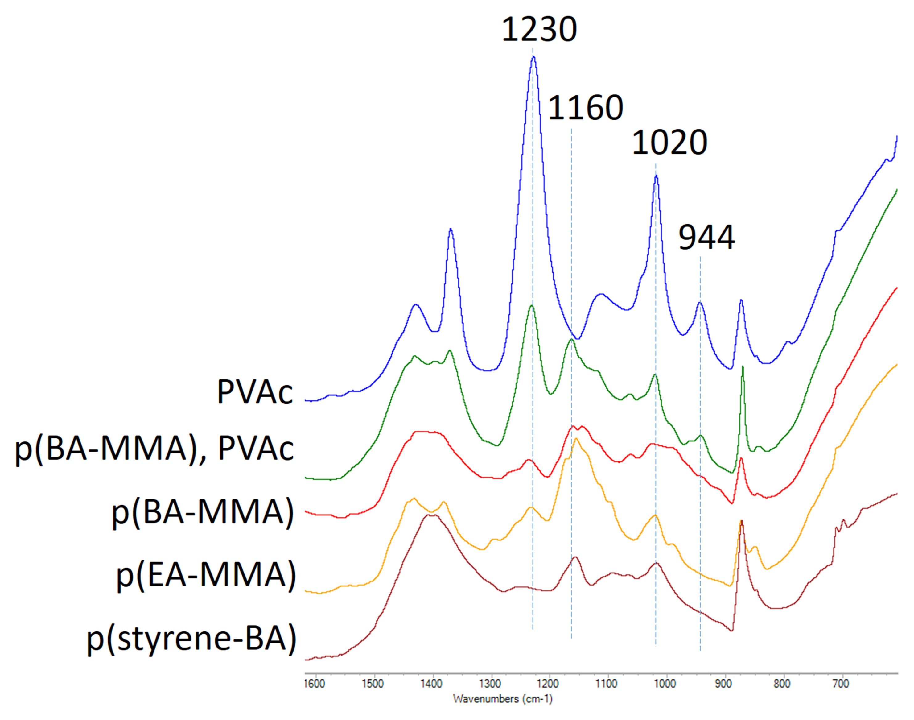 The synthetic emulsion primings found in this study reflect commercial development over the past seventy years. However, where industry has broadly transitioned from PVAc and PVAc-acrylic copolymers to acrylics and styrenated acrylics (Schwartz, M., and H. Kossmann. 1998. “Acrylic and Acrylic/Styrene Copolymer Dispersions.” European Coatings Journal 3: 134–40.), PVAc remains a common constituent in commercially primed artist canvases.