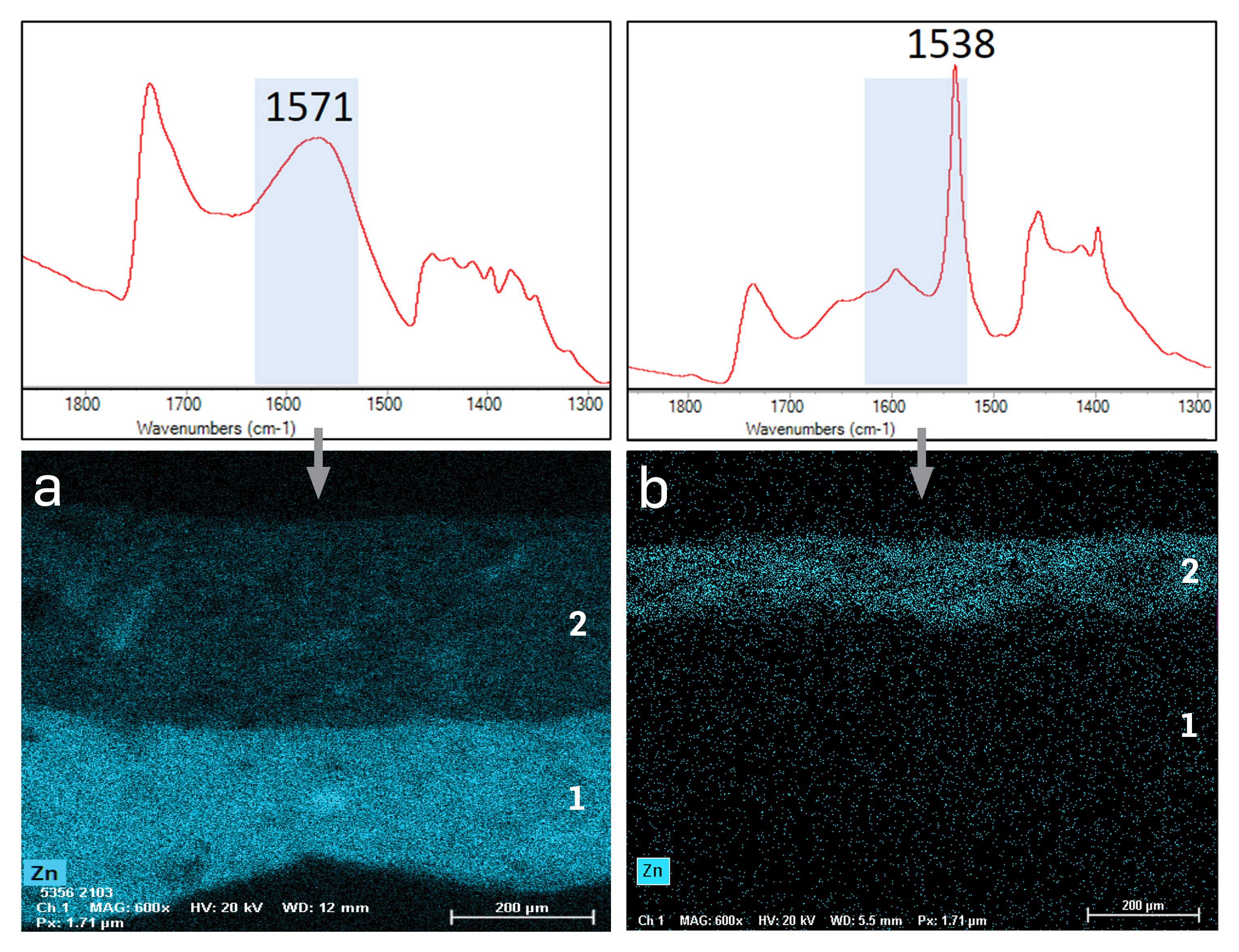Amorphous zinc carboxylates (broad band centered 1571 cm−1) were found at the top surface of the double oil priming where zinc oxide was present only in the underlayer. This suggests in situ formation of zinc soaps and migration from the lower layer to the surface (fig. 62.3a).
