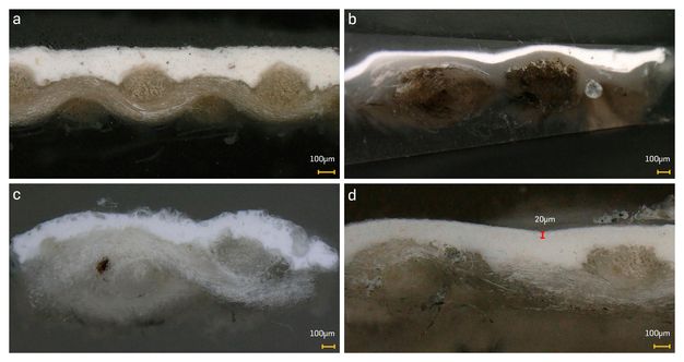 Fourteen different pigment and filler combinations were identified. The most frequent combinations are detailed in table 62.1. Two-thirds of synthetic primings were composed of titanium dioxide and chalk; some also contained talc. Nine percent of samples contained chalk only. Pigmentation of layers also varied within samples; for example, titanium white was sometimes found only in the top of double-layered priming (see fig. 62.2b).