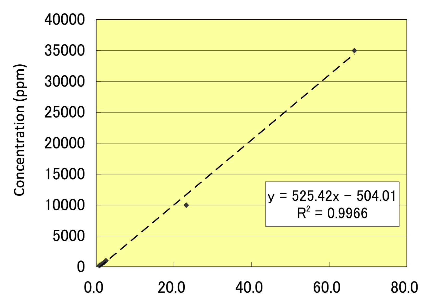 The residual chlorine CI values were measured using X-ray fluorescence spectroscopy (XRF). The obtained values were in centipoise (cP), so a calibration curve was prepared to convert these into parts-per-million (ppm) values. As the affected acrylic painting canvas was on cotton, we prepared a cotton cloth for our trials. We also prepared CI water solutions of 1, 10, 50, 100, 200, 300, 500, 700, 1000, 10,000, 35,000, and 100,000 ppm. These were applied to pieces of the cotton cloth and then dried. These were set as reference standards and measured using XRF. We targeted a figure of 33 ppm (the CI value of drinking water in Tokyo) for the residual CI density on the post-treatment canvas (fig. 63.3).