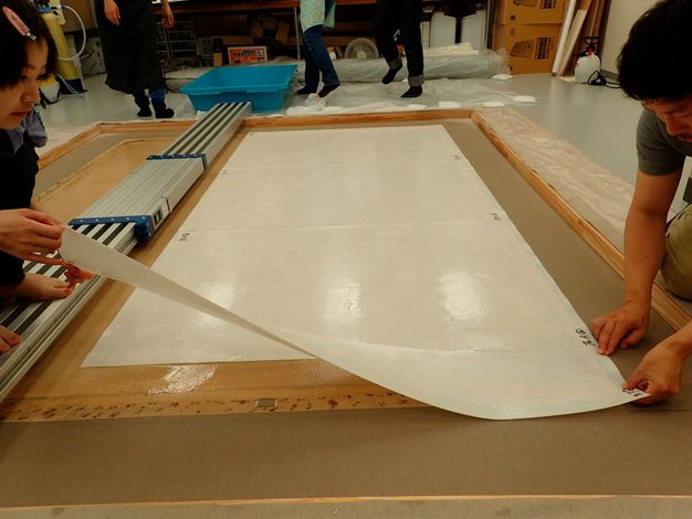 The desalination work to remove the embedded grime and salt from the canvases could not be undertaken with any solvent besides water. However, there was a danger that water might cause the canvas to shrink or the surface paints to peel off. We focused on the conservation state of fifteen large acrylic paintings among those canvas paintings damaged by the tsunami.