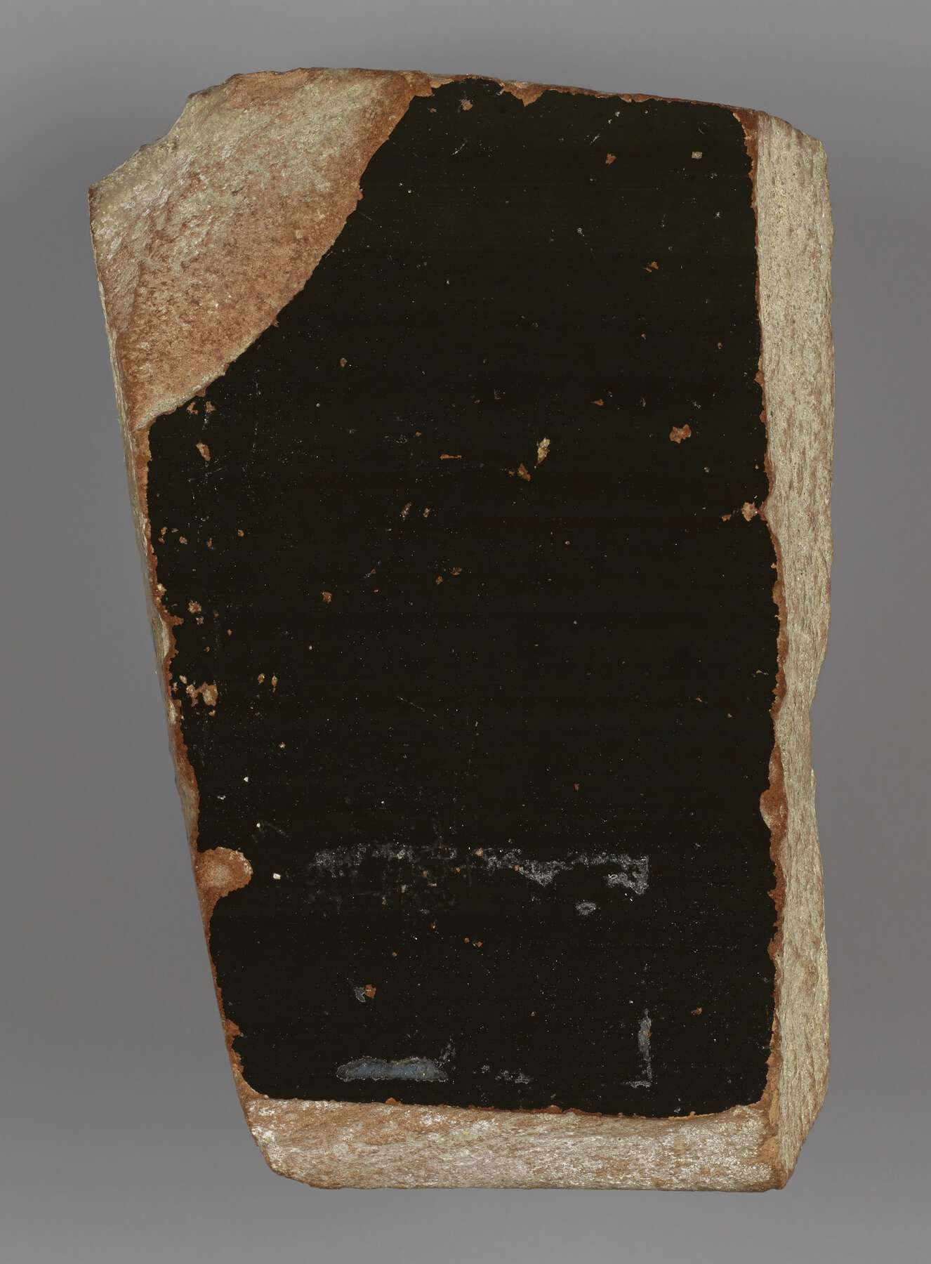 Maximum preserved dimensions: height 4.9 cm; width 3.3 cm; thickness 1.1 cm. Surface scratched; chips missing on exterior and interior.